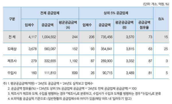 특히 상위 5% 공급업체만을 볼때 전체 업체수는 206곳이 완제약을 공급했으며 73조5456억원을 찍어 전체의 73%를 차지했다. 반대로 상위 5%를 제외한 95%가 불과 27%를 나눠 공급했다.