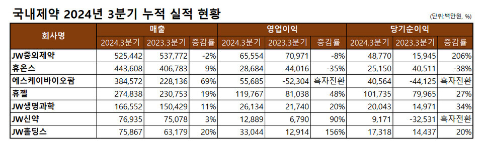 반면 지주사인 JW홀딩스는 매출 759억원으로 전년동기 632억원 대비 20% 성장했다. 영업이익과 순이익도 각각 156%, 20%씩 증가했다.