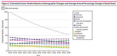 폐암은 금연 등의 효과로 사망율이 낮아짐에도 불구 암관련 주된 사망원인으로 그 위치를 유지할 할 것으로 봤다. 이어 비만 등의 원인으로 인해 증가한 췌장암과 간, 결장암이 그 뒤를 이을 것으로 전망했다.
